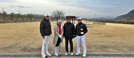 고령군 대가야파크골프장에서 프로선수들이 실제 경기 상황과 표준 자세를 연출 후 기념촬영을 하고 있다.사진=고령군(포인트경제) |