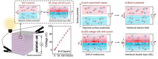 연구팀은 "생체 세포막을 이온이 선택적으로 이동할 때 전압이 발생하는 '막전위' 현상에 착안해 단위 전기셀을 개발하고, 이를 전기가오리처럼 적층해 고전압 전기를 만들어낼 수 있었다"고 설명했다.