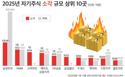 기업별로는 삼성전자가 3조487억원으로 가장 많았다. 전체 자사주 소각 규모의 14.5%에 해당한다. 이어 HMM(2조1432억원), 고려아연(1조8156억원), 메리츠금융지주 순이었다.