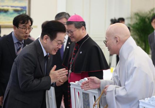 이재명 대통령이 12일 청와대에서 열린 종교지도자 초청 오찬간담회에서 한국종교지도자협의회 공동의장인 대한불교조계종 총무원장 진우스님과 인사하고 있다.[사진=연합뉴스] |