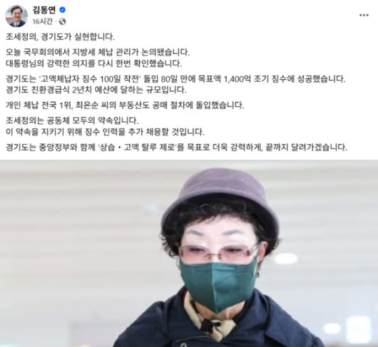 [필드뉴스=경기 강성원 기자] 김동연 경기도지사가 지난 20일 자신의 SNS를 통해 지방세 고액체납자 징수 성과를 공개하며 조세정의 실현 의지를 재확인했다.