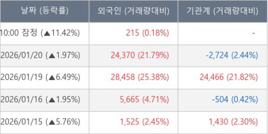 [서울=뉴스핌] 로보뉴스 = 21일 10시 15분 현재 타이거일렉(219130)은 전일 대비 11.42% (현재가 31,700원) 상승했고, 외국인이 최근 6일 연속 순매수(누적 69,762주, 잠정) 행진을 하고 있다.