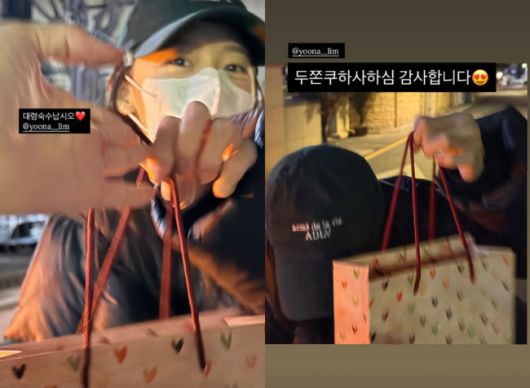 공개된 사진에는 늦은 밤 윤아와 만나 쇼핑백을 건네받는 수영의 모습이 담겼다. 수영은 "두쫀쿠 하사하심 감사합니다"라며 윤아를 향해 정중히 고개를 숙여 웃음을 자아냈다.
