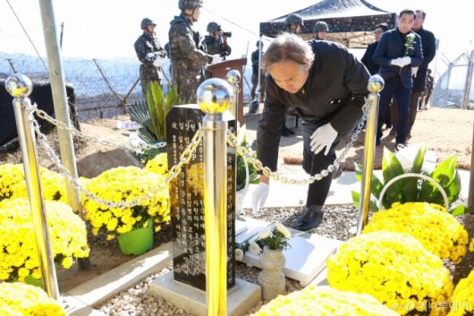 [서울=뉴시스] 내란극복·미래국방 설계를 위한 민관군 합동 특별자문위원회군 사망사고 대책 분과 위원회(군 사망사고 분과위)는 28일 12사단 일반전초(GOP) 부대를 방문했다고 밝혔다. 박찬운 군 사망사고 분과위원장이 고(故) 김상현 이병 추모비를 참배하고 있다. (사진=국방부 제공) 2025.10.28. |
