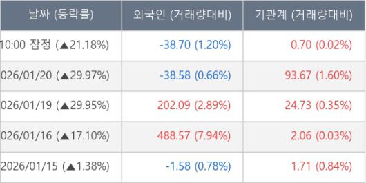 [서울=뉴스핌] 로보뉴스 = 21일 10시 15분 현재 우리기술(032820)은 전일 대비 21.18% (현재가 9,670원) 상승했고, 기관이 최근 5일 연속 순매수(누적 122.87만 주, 잠정) 행진을 하고 있다.