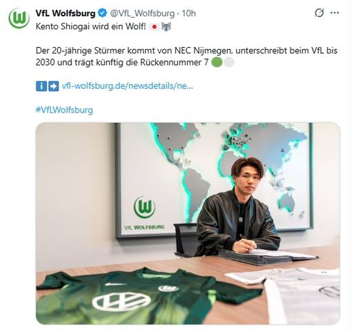 볼프스부르크는 20일(현지시간) NEC 네이메헌(네덜란드)에서 시오가이 겐토를 영입해 공격력을 강화했다고 밝혔다.