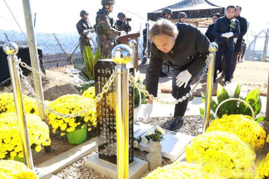 군 사망사고 분과위원장인 박찬운 교수가 김상현 이병 추모비에 헌화하고 있다. 국방부 제공 |