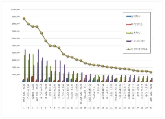 아이돌 개인 브랜드평판 1위를 기록한 방탄소년단 지민 브랜드는 참여지수 195,876, 미디어지수 376,856, 소통지수 3,736,419, 커뮤니티지수 4,471,812로 집계되며 브랜드평판지수 8,780,962를 기록했다. 이는 지난 12월 브랜드평판지수 6,957,990과 비교해 26.20% 상승한 수치다.