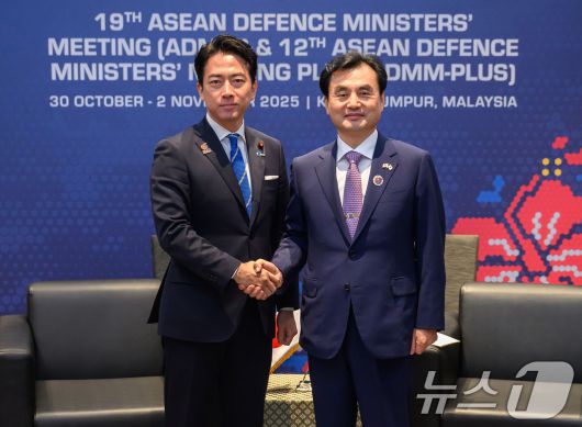 안규백 국방장관이 지난해 11월 말레이시아 쿠알라룸푸르에서 열린 제12차 아세안 확대 국방장관회의에 참석해 고이즈미 신지로 일본 방위대신과 회담에 앞서 악수하고 있다. (국방부 제공. 재판매 및 DB 금지) 2025.11.1/뉴스1 |