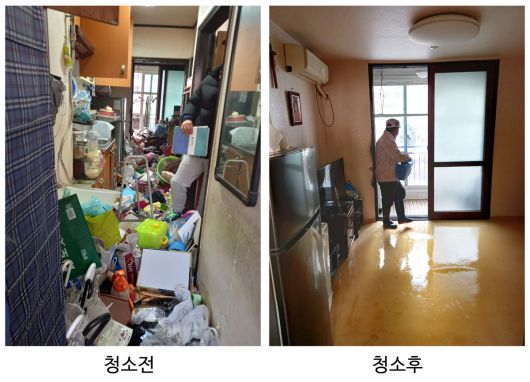 강남구의 취약계층 주거환경 개선 사업의 일환으로 진행된 특수 청소 전후의 비교 사진. 강남구 제공 |