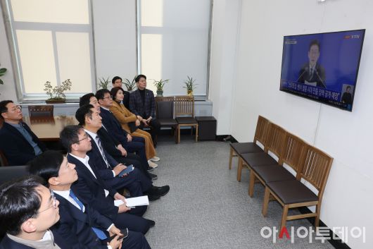 아시아투데이 송의주 기자 = 정청래 더불어민주당 대표와 한병도 원내대표를 비롯한 지도부가 21일 국회에서 이재명 대통령의 신년 기자회견 생중계를 지켜보고 있다. ⓒ "젊은 파워, 모바일 넘버원 아시아투데이"