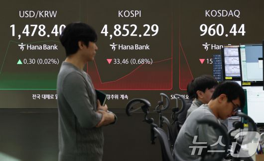 그린란드 사태 충격으로 미국 증시가 일제히 급락한 21일 오전 서울 중구 하나은행 본점 딜링룸 전광판에 코스피 지수가 전 거래일 대비 33.46p(0.68%) 하락한 4,852.29를 기록하고 있다. 2026.1.21/뉴스1 ⓒ News1 최지환 기자 |