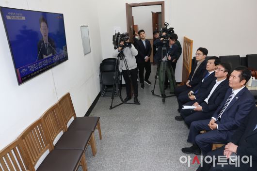 아시아투데이 송의주 기자 = 정청래 더불어민주당 대표와 한병도 원내대표를 비롯한 지도부가 21일 국회에서 이재명 대통령의 신년 기자회견 생중계를 지켜보고 있다. ⓒ "젊은 파워, 모바일 넘버원 아시아투데이"