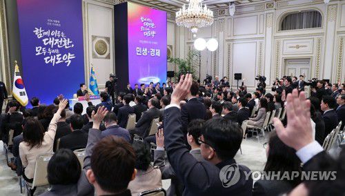 (서울=연합뉴스) 김도훈 기자 = 이재명 대통령이 21일 청와대 영빈관에서 열린 신년기자회견에서 취재진 질문을 받고 있다. 2026.1.21