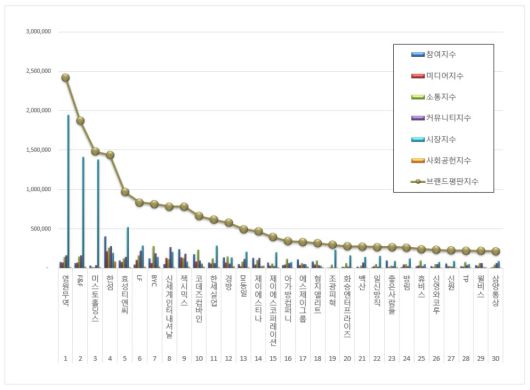 3위 미스토홀딩스 브랜드는 참여지수 33,463, 미디어지수 11,689, 소통지수 13,232, 커뮤니티지수 35,331, 시장지수 1,376,867, 사회공헌지수 9,344로 브랜드평판지수 1,479,927을 기록했다. 이는 지난 12월 브랜드평판지수 1,447,898과 비교해 2.21% 상승한 결과다.