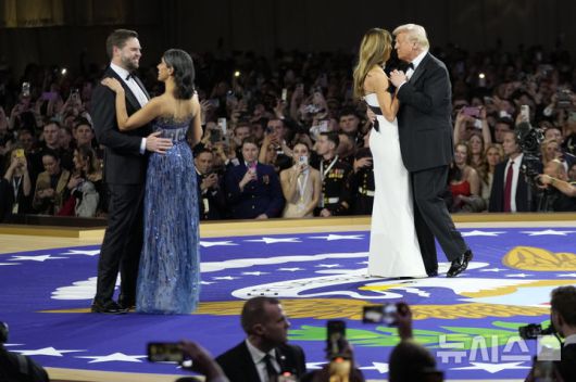 [워싱턴=AP/뉴시스] 도널드 트럼프 미국 대통령 부부(오른쪽)와 JD 밴스 부통령 부부가 20일(현지 시간) 워싱턴에서 열린 '사령관 무도회'(Commander in Chief Ball)에서 춤추고 있다. 트럼프 대통령 취임 축하 무도회는 '사령관 무도회', '자유의 취임 무도회'(Liberty Inaugural Ball), '스타라이트 무도회'(Starlight) 등 3개로 구성된다. 2025.01.21. |