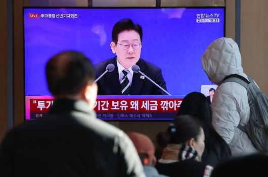 21일 서울 용산구 서울역 대합실에서 시민들이 이재명 대통령 신년 기자회견 방송을 지켜보고 있다./연합뉴스 |