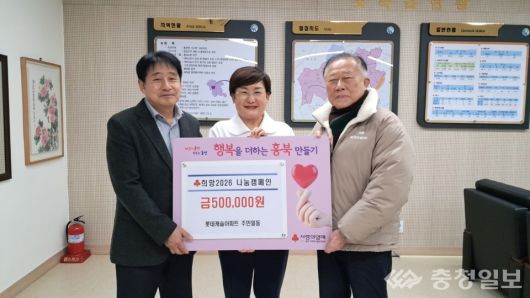 충남 홍성군은 내포롯데캐슬아파트는 지난 20일 홍북읍 행정복지센터에서 실시하고 있는 '희망2026 나눔캠페인'에 성금 50만원을 기탁하며 이웃사랑 실천에 동참했다.