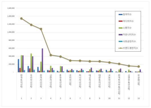 부동산신탁 브랜드평판 1위를 기록한 한국토지신탁 브랜드는 참여지수 330,014, 미디어지수 107,958, 소통지수 426,521, 커뮤니티지수 422,001, 사회공헌지수 59,589로 집계되며 브랜드평판지수 1,346,083을 기록했다. 이는 지난 12월 브랜드평판지수 1,510,909와 비교해 10.91% 하락한 수치다.