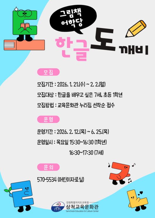 장병진 삼척교육문화관장은 “그림책을 활용한 한글 학습을 통해 아이들이 읽고 쓰는 즐거움을 느끼고, 학교 학습의 기초를 안정적으로 다질 수 있는 계기가 되길 바란다”라고 말했다.