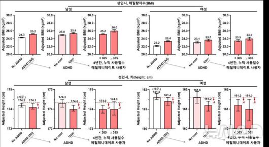 키의 경우 ADHD 진단 여부만으로는 성인기 평균 신장에 차이가 없었으며, 메틸페니데이트 치료군에서 평균 신장이 소폭 낮게 나타났으나 여성에서도 차이는 1㎝ 미만으로 임상적 의미는 제한적이었다.