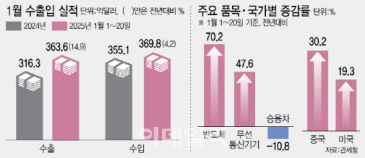최대 수출품목인 반도체가 전체 실적을 이끌었다. 이 기간 수출액이 107억 3000만달러로 전년대비 70.2% 증가했다. 인공지능(AI)발 글로벌 수요 확대에 힘입은 반도체는 지난해 연간으로도 전년대비 22.2% 늘어난 1734억달러의 역대 최대 실적을 기록했는데 그 흐름이 연초에도 이어지고 있는 것이다. 전체 수출에서 반도체 수출이 차지하는 비중도 29.5%로 불어났다.