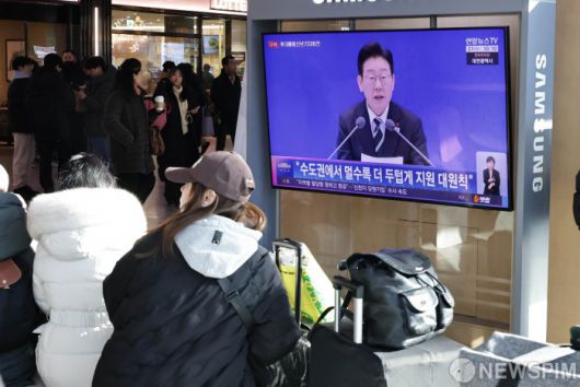[서울=뉴스핌] 양윤모 기자 = 21일 오전 서울 용산구 동자동 서울역을 찾은 시민들이 ‘함께 이루는 대전환, 모두 누리는 대도약’의 슬로건으로 개최된 이재명 대통령의 ‘2026년 신년 기자회견’을 시청하고 있다.  이번 신년 기자회견은 용산 대통령실에서 청와대로 온 뒤 열리는 첫 공식 기자회견으로 청와대 영빈관에서 내외신 기자 160여명이 참석한 가운데 90분간 진행됐다. 2026.01.21 yym58@newspim.com