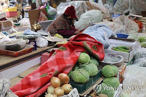 (서울=연합뉴스) 박동주 기자 = 강추위가 계속된 21일 서울 인왕시장에서 한 상인이 채소에 이불을 덮어놓은 채 장사를 하고 있다. 2026.1.21