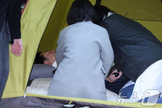 (서울=뉴스1) 신웅수 기자 = 장동혁 국민의힘 대표가 21일 서울 여의도 국회 로텐더홀에 마련된 단식 농성장에서 건강 상태를 확인하고 있다. 2026.1.21/뉴스1