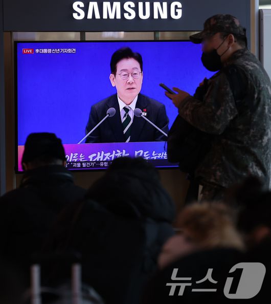 (서울=뉴스1) 오대일 기자 = 21일 오전 서울 중구 서울역 대합실에서 시민들이 이재명 대통령의 2026 신년 기자회견 생중계를 지켜보고 있다. 2026.1.21/뉴스1