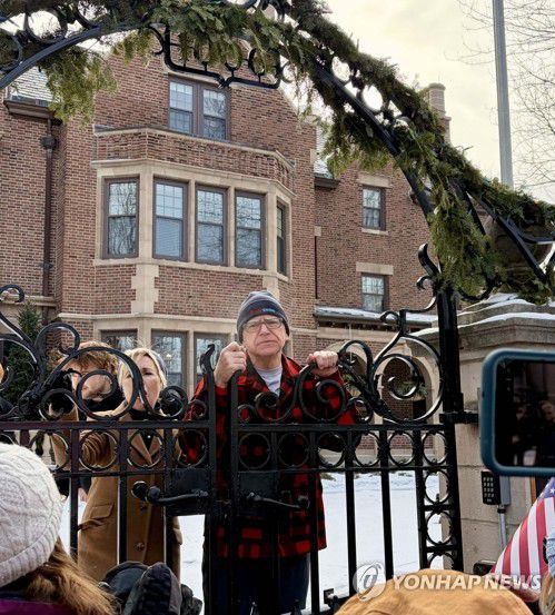 (세인트폴=연합뉴스) 권영전 특파원 = 민주당 소속 팀 월즈 미네소타주 주지사가 20일(현지시간) 세인트폴에 있는 자신의 관저 앞에서 진행된 시위 참가자들을 격려하고 있다. 2026.1.21