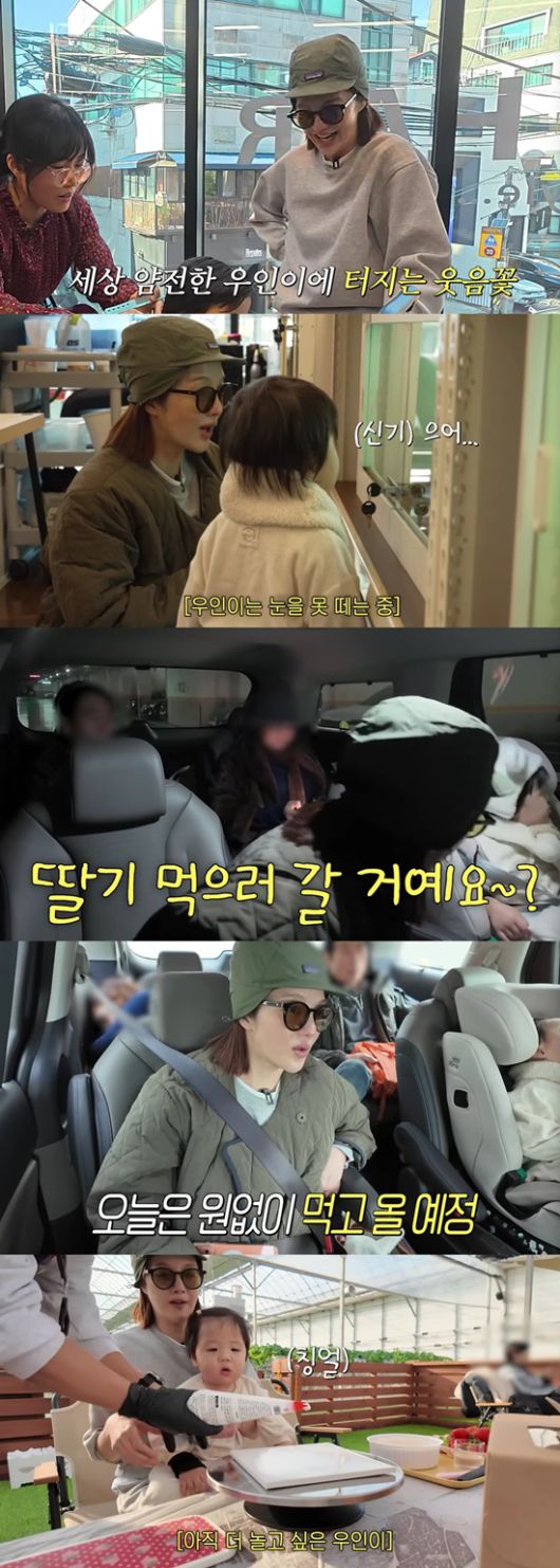 "여기는 촬영지옥이다. 못 따라가겠다. 그냥 풀샷으로 잡아라"라며 "나들이 나오면 좋은데 오면 지옥이다. 그래도 안울고 놀면 너무 좋다. 집 가서 꿀잠자면 최고다. 그래서 엄마들이 나오는거다.