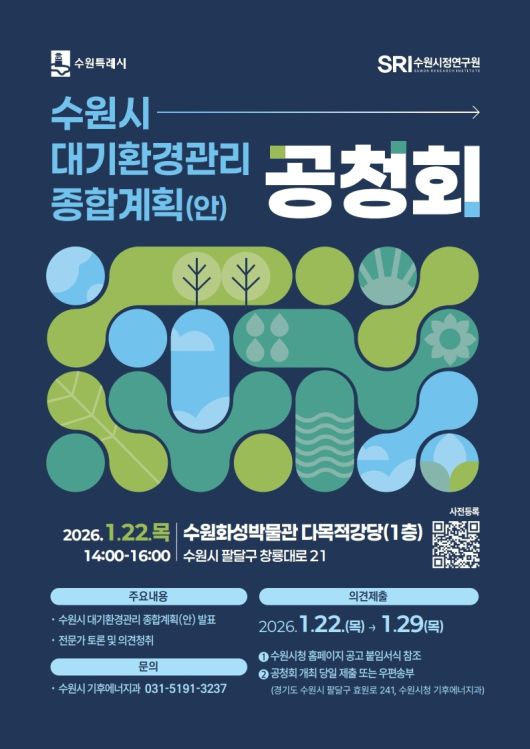 수원특례시는 22일 오후 2시부터 4시까지 수원화성박물관 다목적강당에서 '수원시 대기환경관리 종합계획(안) 공청회'를 열고 시민 의견을 수렴한다.