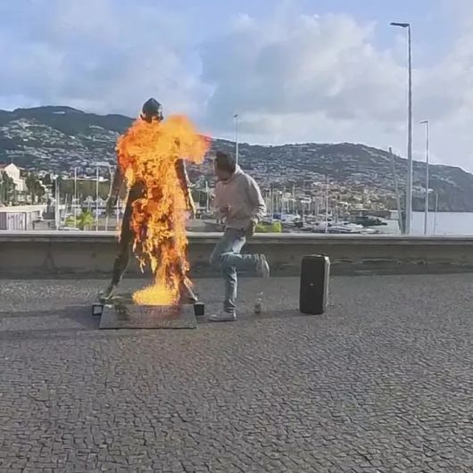 헝클어진 모습의 이 남성은 'CR7' 박물관 외부에 있는 호날두의 청동 모형에 인화성 액체를 붓고 라이터로 불을 붙였다. 불길이 조각상을 집어삼켰고, 그의 상의에도 불이 붙을 뻔했다.