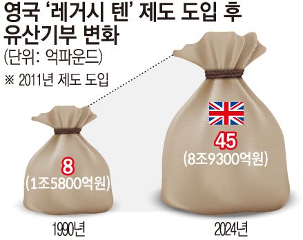 법안은 세제 혜택으로 유산 기부를 활성화하려는 취지로, 2011년 영국이 도입했던 '레거시 텐(Legacy 10)' 제도의 한국판 법안인 셈이다. 영국은 2011년 유산 기부를 유도하기 위해 유산 10%를 기부하면 상속세 10%를 감면해 상속세율을 40%에서 36%로 10% 감면해주는 레거시10 제도를 도입했다. 제도 도입 이후 영국의 유산 기부 규모는 1990년 8억 파운드(1조5800억 원)에서 2024년 45억 파운드(8조9300억 원)로 크게 늘었다.