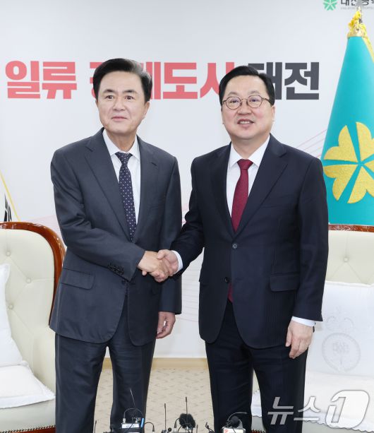 (대전=뉴스1) 김기태 기자 = 이장우 대전시장과 김태흠 충남도지사가 21일 대전시청 접견실에서 대전·충남 행정통합 관련 긴급 회동에 앞서 악수하고 있다. 2026.1.21/뉴스1presskt@news1.krCopyright ⓒ 뉴스1. All rights reserved. 무단 전재 및 재배포, AI학습 이용 금지.