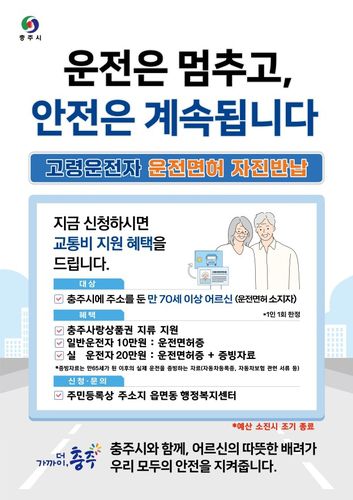(충주=연합뉴스) 충북 충주시는 만 70세 이상 고령운전자의 교통사고 예방을 위해 운전면허 자진반납 인센티브를 올해부터 기존 10만원에서 20만원으로 확대해 지급한다고 21일 밝혔다.