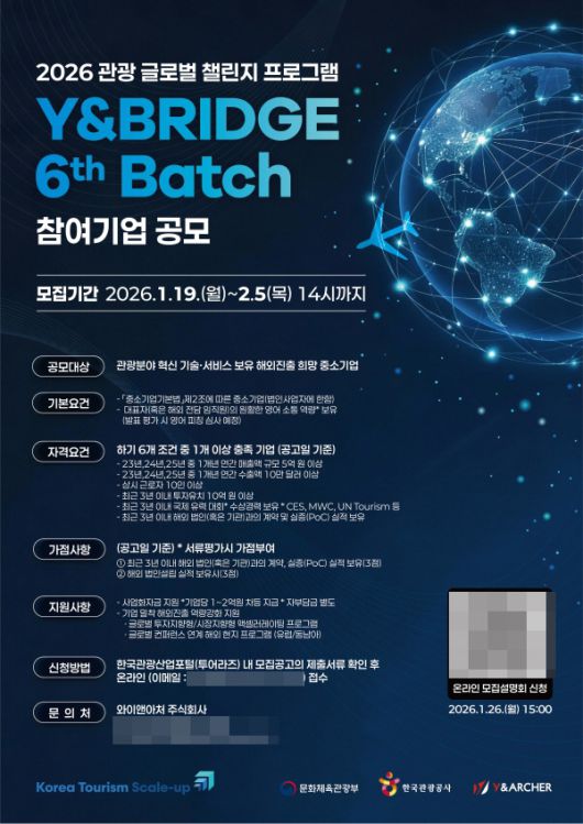글로벌 액셀러레이터 와이앤아처(대표 신진오·이호재)가 문화체육관광부와 한국관광공사가 주관하는 '2026년 관광 글로벌 챌린지 프로그램(Y&Bridge 6th Batch)'의 참여 기업을 2월 5일 14시까지 모집한다고 밝혔다.