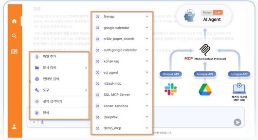 코난테크놀로지 관계자는 "외부 시스템과의 연동을 위한 표준 규격인 MCP를 지원해 검색 엔진, 데이터베이스, 협업 도구 등 다양한 외부 도구를 구조화하고 안전하게 호출할 수 있도록 설계해 단순 응답을 넘어 실제 업무의 완결성을 높였다"고 밝혔다.