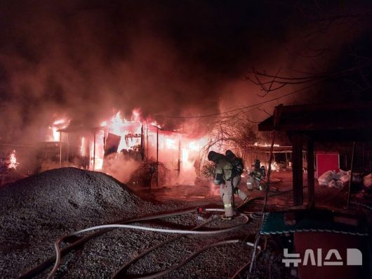 [김해=뉴시스] 김상우 기자 = 21일 오전 0시 48분께 경남 김해시 대동면 농막에서 화재가 발생했다.