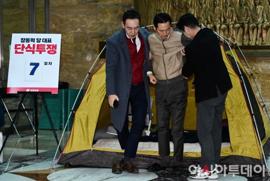 아시아투데이 이병화 기자 = '통일교 게이트 특검·민주당 공천뇌물 특검' 수용을 촉구하며 7일째 단식을 이어가고 있는 장동혁 국민의힘 대표가 21일 국회 로텐더홀에서 단식 농성을 이어가기 위해 텐트를 나서고 있다. ⓒ "젊은 파워, 모바일 넘버원 아시아투데이"