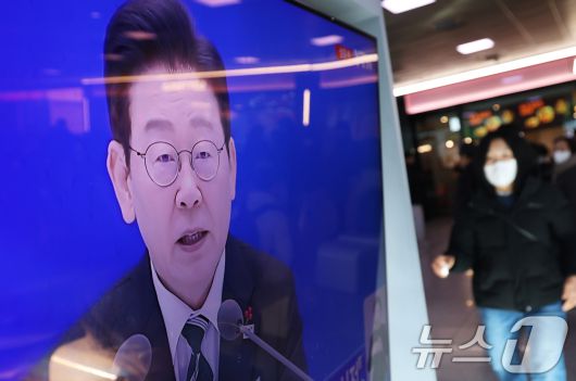 (서울=뉴스1) 오대일 기자 = 21일 오전 서울 중구 서울역 대합실에서 시민들이 이재명 대통령의 2026 신년 기자회견 생중계를 지켜보고 있다. 2026.1.21/뉴스1