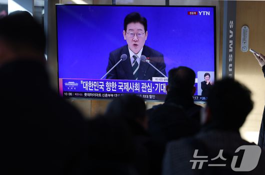(서울=뉴스1) 오대일 기자 = 21일 오전 서울 중구 서울역 대합실에서 시민들이 이재명 대통령의 2026 신년 기자회견 생중계를 지켜보고 있다. 2026.1.21/뉴스1