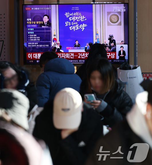 (서울=뉴스1) 오대일 기자 = 21일 오전 서울 중구 서울역 대합실에서 시민들이 이재명 대통령의 2026 신년 기자회견 생중계를 지켜보고 있다. 2026.1.21/뉴스1