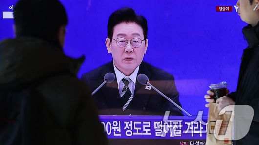 (서울=뉴스1) 오대일 기자 = 21일 오전 서울 중구 서울역 대합실에서 시민들이 이재명 대통령의 2026 신년 기자회견 생중계를 지켜보고 있다. 2026.1.21/뉴스1