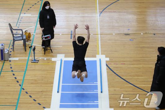 (대구=뉴스1) 공정식 기자 = 21일 오전 대구 달서구 계명대학교 성서캠퍼스 체육관에서 열린 '2026학년도 대입 정시모집 체육학과 실기고사'에서 한 수험생이 제자리멀리뛰기를 하고 있다. 2026.1.21/뉴스1