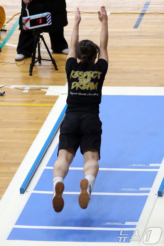(대구=뉴스1) 공정식 기자 = 21일 오전 대구 달서구 계명대학교 성서캠퍼스 체육관에서 열린 '2026학년도 대입 정시모집 체육학과 실기고사'에서 한 수험생이 제자리멀리뛰기를 하고 있다. 2026.1.21/뉴스1