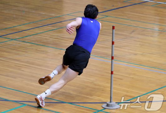 (대구=뉴스1) 공정식 기자 = 21일 오전 대구 달서구 계명대학교 성서캠퍼스 체육관에서 열린 '2026학년도 대입 정시모집 체육학과 실기고사'에서 한 수험생이 Z자 달리기를 하고 있다. 2026.1.21/뉴스1