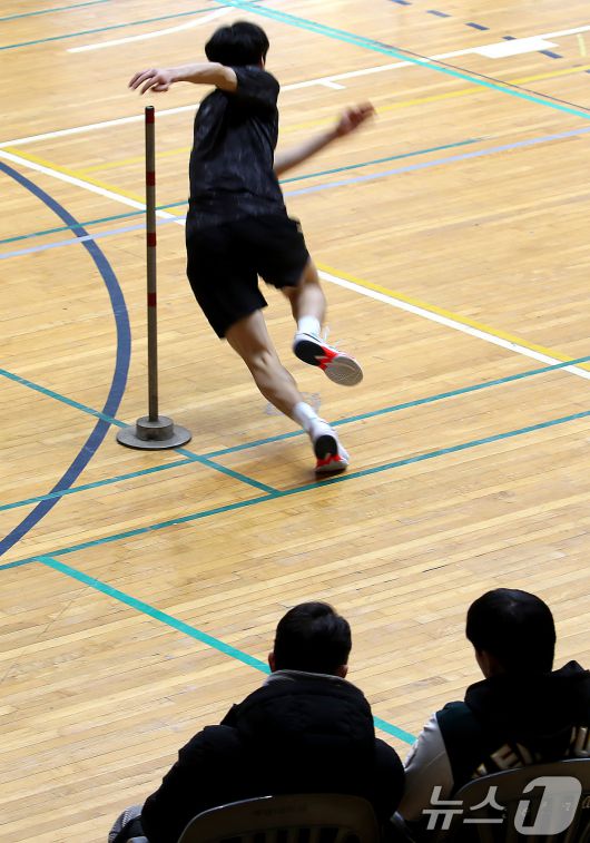 (대구=뉴스1) 공정식 기자 = 21일 오전 대구 달서구 계명대학교 성서캠퍼스 체육관에서 열린 '2026학년도 대입 정시모집 체육학과 실기고사'에서 한 수험생이 Z자 달리기를 하고 있다. 2026.1.21/뉴스1
