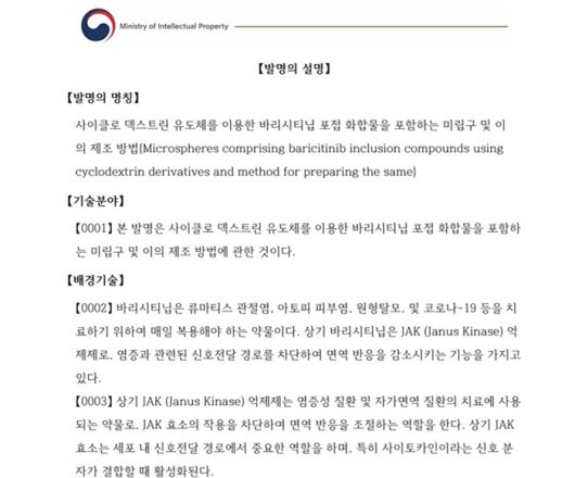 삼익제약 측은 “바리시티닙과 같은 난용성 약물은 미립구(마이크로스피어) 제조 과정에서 약물이 내부에 충분히 담기지 않는 낮은 봉입률이 기술적 난제로 꼽혀왔다”며 “약물 분자를 고리 모양 구조 내부에 가두는 포접 기술을 통해 이를 해결했다”고 설명했다.